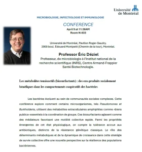 As part of our upcoming departmental seminar, we are pleased to welcome Éric Déziel, Professor at INRS-Institut Armand-Frappier, and invited speaker of Dr. Marylise Duperthuy. The presentation will be delivered in French.