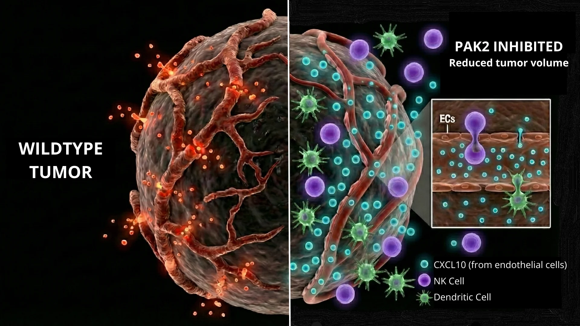 The most striking finding of the study was that the loss of PAK2 in endothelial cells triggered a robust innate immune response. The tumors deficient in endothelial PAK2 showed a significant increase in the infiltration of dendritic cells and NK cells, which are crucial for recognizing and killing cancer cells.