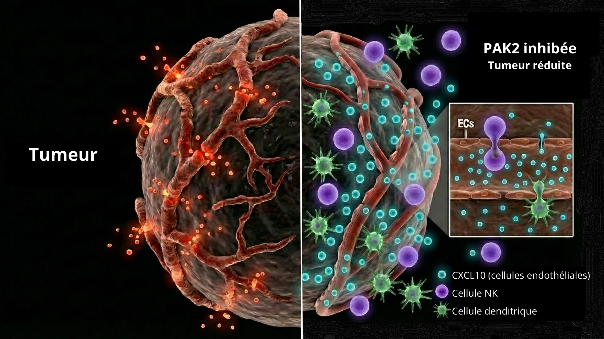 La connexion immunitaire : L’axe CXCL10 Pour comprendre comment la suppression d’une kinase dans les parois des vaisseaux sanguins pouvait appeler les cellules immunitaires, l’équipe a analysé les changements génétiques au sein de la tumeur. Ils ont découvert que PAK2 agit comme un régulateur qui supprime la production de chimiokines — des protéines de signalisation qui attirent les cellules immunitaires. Plus précisément, la suppression de PAK2 a conduit à une augmentation de l’expression de CXCL10, un puissant chimio attractif.